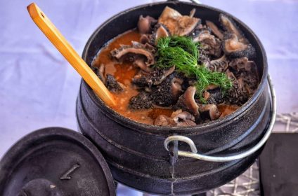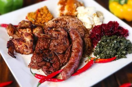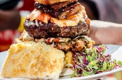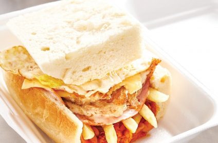 The bread is hollowed out, filled first with a layer of seasoned fries (Called Amachips), then topped with optional layers of sauce, cheese, egg, russian, polony, archaar or chakalaka and burger. The multi-layered sandwich is packed into an instantly-recognizable white plastic sack or paper.